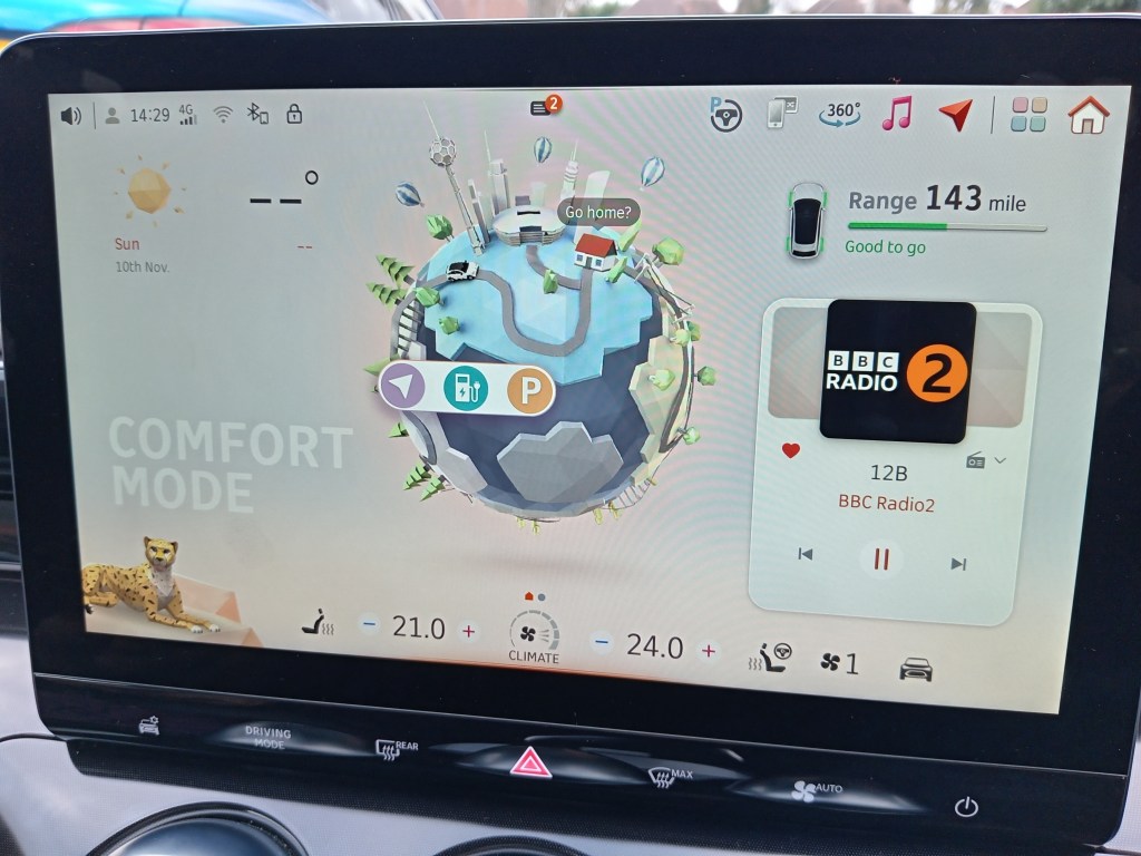These include a graphic of an animated cheetah, amusing for some but potentially distracting, but the screen is easy enough to use, eventually, as some controls like heating and door mirror adjustment are embedded. But you get used to it.