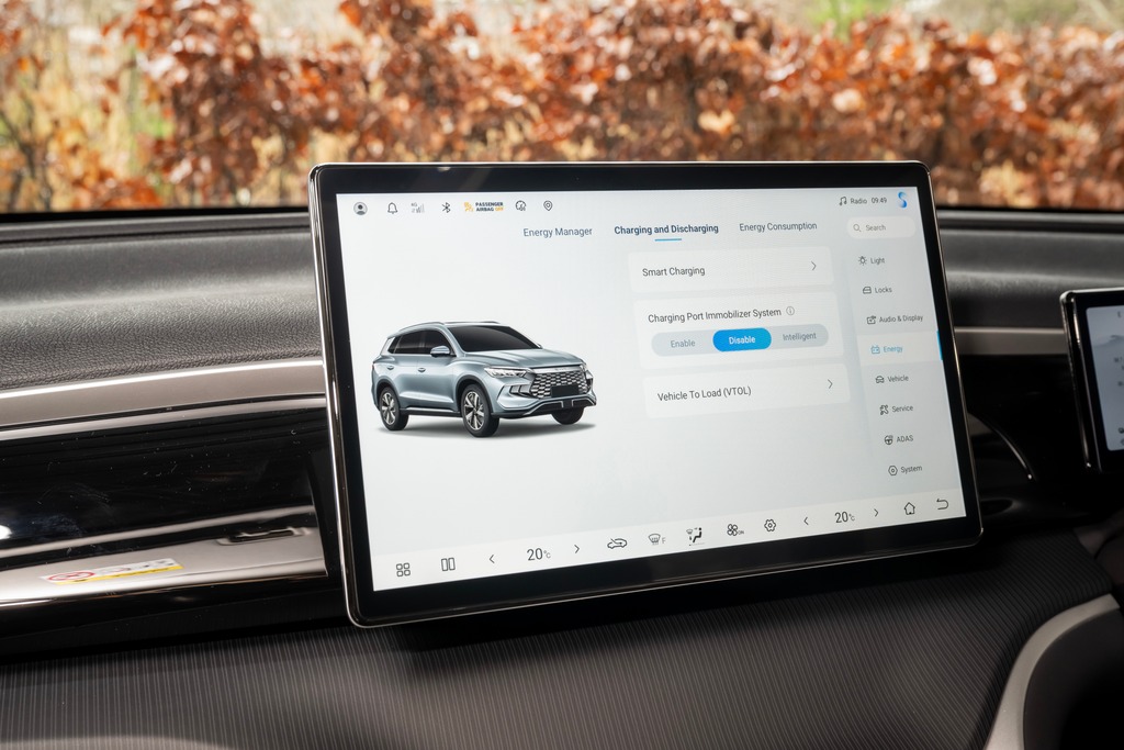 The rotating touchscreen controls infotainment, navigation and connectivity via built-in 4G and BYD cloud services. Intelligent voice control, activated by saying “Hi, BYD,” offers extra safety while driving. An added bonus is its Vehicle-to-Load function, which lets you use the car as a giant power bank for everything from camping to powering a coffee maker.