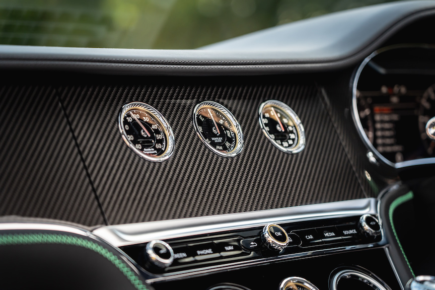 Like other German car makers, Bentley provides plenty of options with the rotating display, a particularly clever piece of kit. It switches between touchscreen, three analogue gauges (compass, chronometer and outside temperature) and unbroken veneer.
