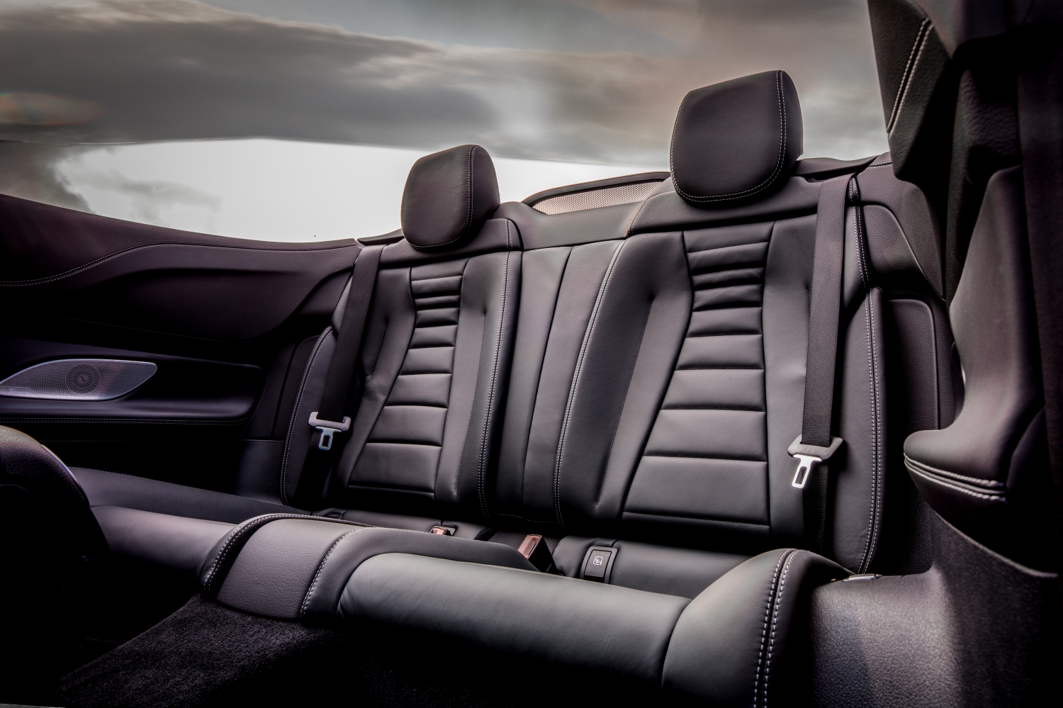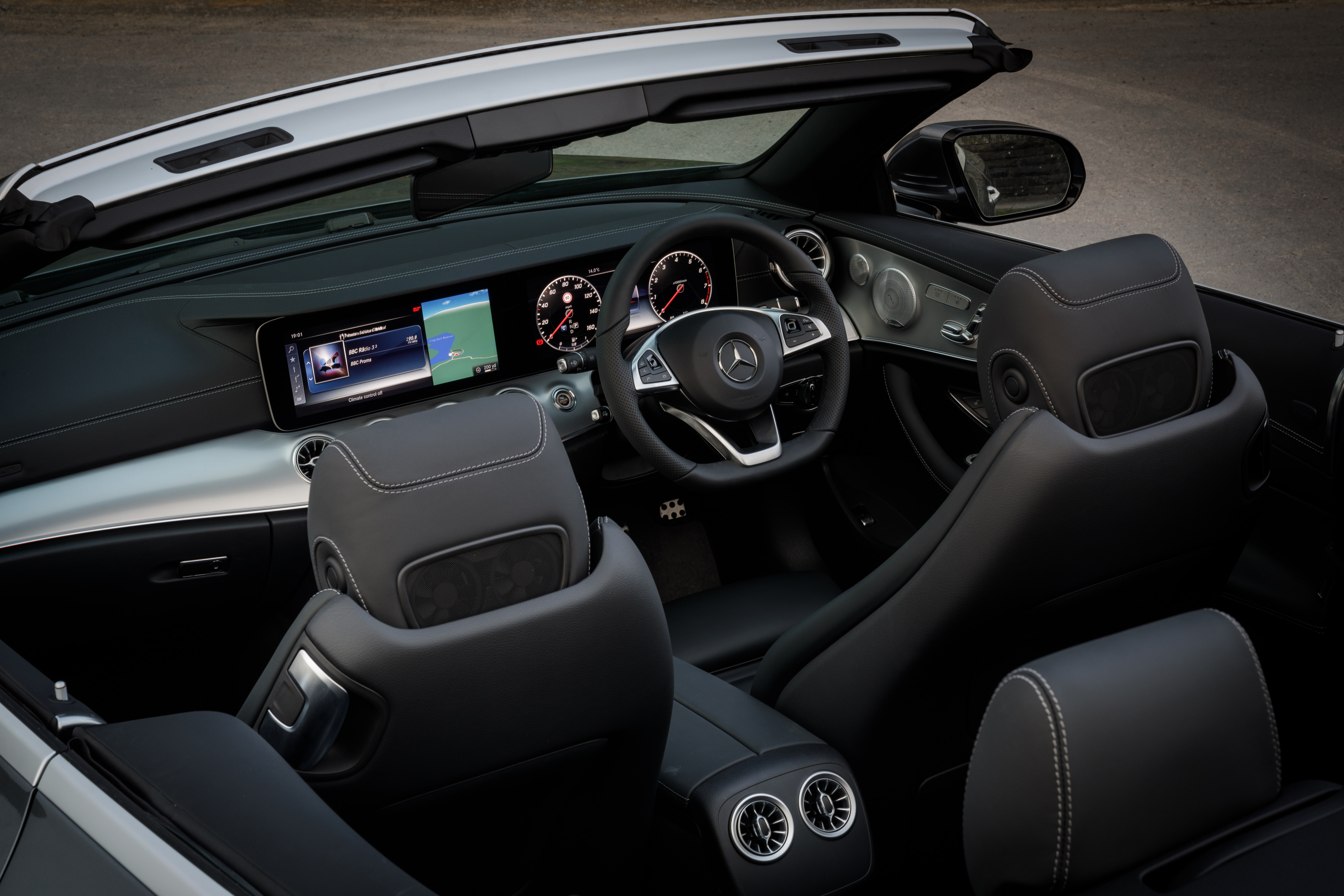 The all-new 50:50 folding rear seat backrests create a through-loading feature in the interior, boosting the E-Class Cabriolet’s everyday practicality.Generous centre-cubby storage with a divided, butterfly-door armrest and good sized doorbins provide room for clutter, though the cupholders are worryingly close to some expensive electronics. Standard equipment includes adaptive brake lights and active brake assist, cruise control with speed limiter and attention assist.