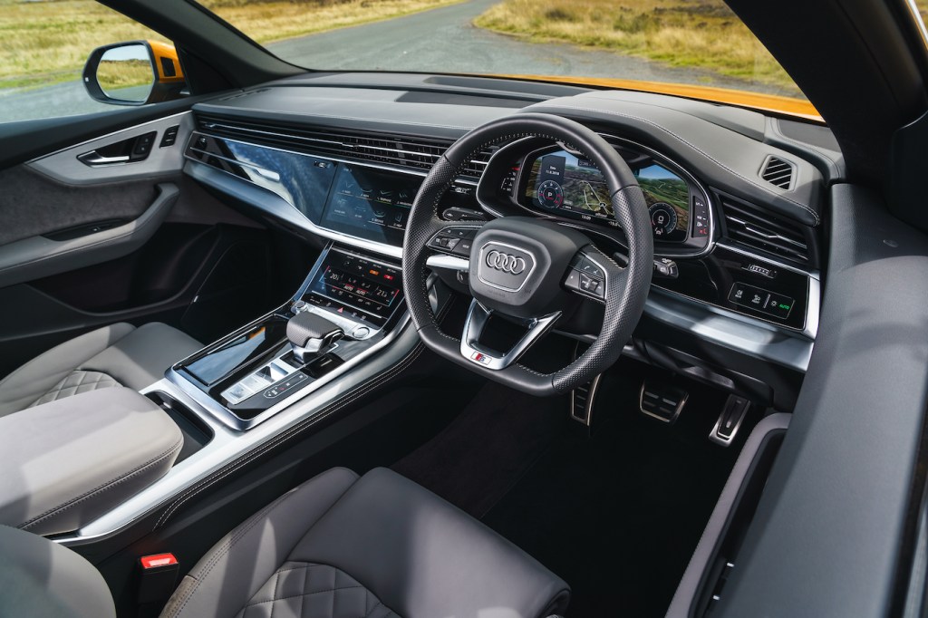 The Q8 is still very large, with styling cues from the original Audi quattro. ThisS line includes high definiition LED lights, 21-inch alloy wheels and adaptive air suspension as standard, not to mention the allwheel drive and eight-speed tiptronic gearbox.